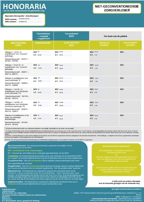 Daarom hebben wij met de collega's van Klein Brabant beslist om, uit respect voor ons beroep, NIET TOE TE TREDEN tot de wurgconventie van M25. Ook hebben we samen een vast tarief afgesproken dat we zullen hanteren vanaf 01/02/2025. Dit bedraagt 35€ per behandeling. In de kader hieronder vind u alle terugbetalingstarieven.